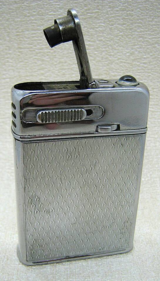Deze aansteker heeft een vast wind scherm. Patent no:27165/49.