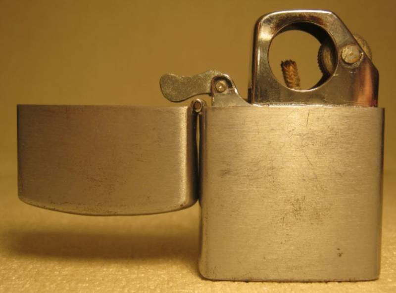 dan aan het vuursteen wiel draaien en daarna de brandende aansteker op de pijpenkop leggen